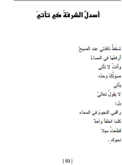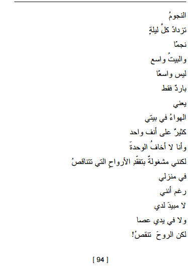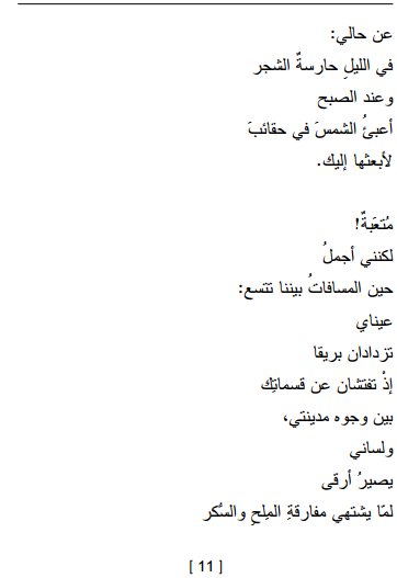 لان ثقبا فى القلب يسقط منه الفرح ...................... جرب تعلمت ان احمل صوتك فى سلتى الخوص اخرجه فى خلوتى ادبلج حروف اسمى بين نسيجه هيا! اسمى ليس صعبا حركه فسكون حركه فسكون ....................... ايتها الجميله التى شاحبه كالثلج فى اغفاءتها ضعفك الان تأمر ظالم ضد هزالى ....................... شمس صفيقه تمط عنقها المتغصن كل صبح من نافذتى تتفقد غرفتى واما توقن ان الشاغر فى سريرى شاغرا لم يزل الا من اكوام كتب مقلوبه تحدق برهه تقذف غضبها فى عينى وتمضى ........................ شويكار السيده تستطيع ان تخفض راسها اذ ما قال لها الحبيب القديم على الهواء "وحشتينى" بعدما تخطت الستين بعقد ونصف تطرق براسيها كيلا نلمح, نحن المشاهدين الاشرار الحيره الممزوجه بالخجل فى عينيها لكن المخرج الشاب يفسد اللحظه الفاتنه بمشاهد الابيض والاسود حيث السيده يافعه جدا وجريئه تعرف كيف تقول لحبيبها "خدنى" ............................ حادث طريق لان سيارتين تحتلان بقعه الارض نفسها فى اللحظه نفسها حرب لان دولتين تريدان الارض ذاتها ايضا يا اخى لست سياره انا وانت لست دوله. ............................. حط اليف ثم انحنى وقبل يدى ادار عنقه ومن وراء قناع الحرب غمز لك فتاتك حلوه فوهبته القرش ثم همس معاتبا انت حبيبها فاحمها من اللصوص والشعراء وانت استرددت منه القرش ولم تحمنى افتح كفك انظر هاهو قرشى رده الى ورد قلبى .............................. الcheese cake ..............................