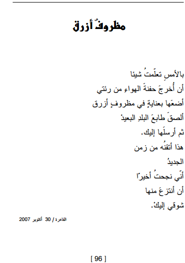 مبحبش النوع دا من الشعر بس فاطمة ناعوت ابدعت في الوصف في بعض القصائد و خلتني اجبها عجبني لم انجح بعد اسدل الستار كي تأتي مظروف ازرق ليس اسمها زهرة بس الجدير بالذكر ان فيه قصائد كتير ملهاش لزمة