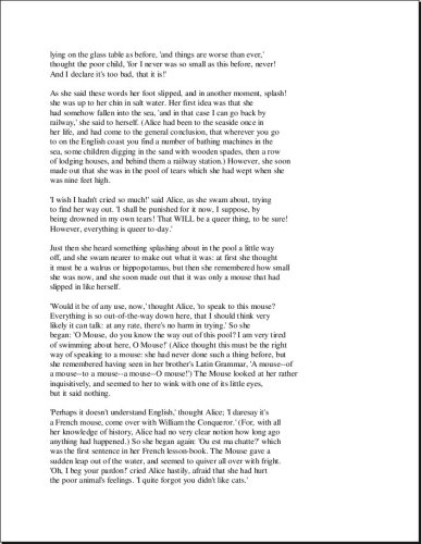 Es una buena entrada parala lógica dentro de la filosofía, matemática o incluso esa lógica analítica de la programación. Mezcla varias materias, lo que lo hace muy interesante. Desde Alicia queda claro que Carroll no vé limites en cuanto a lo que puede hacer en el discurso y como narrador: se la pasa rompiendo la 4ta barrera, hablando de su mundo, hablando de tú mundo, hablando de mundos imaginarios, todo esto en un mismo parrafo.