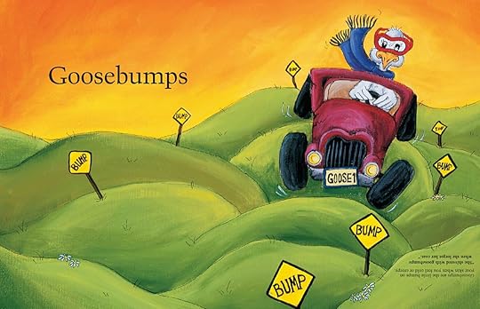 Each one is illustrated in a way that shows what it means in a literal sense. The goose driving over very bumpy ground (goosebumps) or a child with an umbrella walking along as cats and hot dogs fall from the sky (raining cats and dogs) are just two examples of what someone might imagine the idioms mean.