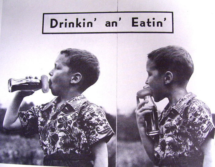 In the delightful The Donut Book we are treated to a tasty variety of interesting factoids, recipes, and retro pix, including this disturbingly awesome one above, which I believe may document the precise moment when the American obesity crisis began.