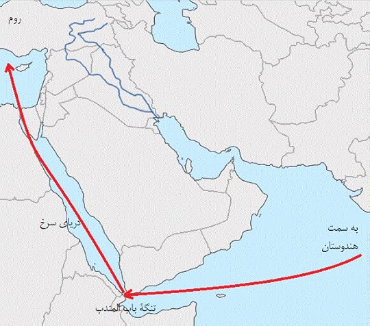 یکی از این مسیرهای آبی، که به خاطر «تنگه» بودن خیلی راحت می شد روش مسلط شد و کشتی های تجاری دیگه نمی تونستن از پرداخت گمرک فرار کنن، تنگۀ «باب المندب» بود، نقطه ای که دریای سرخ به اقیانوس متصل میشه. در شرق تنگه سرزمین یمن قرار داشت و در غرب تنگه، سرزمین حبشه. این تنگه اون قدر اهمیت داشت که چند دولت بر سر تسلط بر اون با هم می جنگیدن، چند دولت بزرگ در این راه سقوط کردن و دولت های دیگه ای به جاشون اومدن، که اون ها هم به نوبۀ خودشون توسط دولت های بعدی مغلوب و نابود شدن.