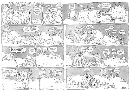 *Unlike conventional doctors, aliens don’t take Wednesdays off. (What, you were expecting maybe details re how the appointment went? For that, you’ll have to read the book. Coming in 2037. Penguin, orange cover of course.) ………………… Next, after Rehearsal's Off!, I read Think Good Thoughts About A Pussycat. This ended up my favorite, not due to the fact that I’m a cat-lover. Only a minority actually feature cats; again, it’s titled after the opening cartoon. A few of the cat cartoons are repeated in About Dogs. Several are about mechanics; several repeat the scene of a man in a tub talking to his wife who is always doing something different out in living room: silently ironing, or sitting at the table. Among my favorites were the cavemen cartoons, including this one. “Ip Gissa Gul”: