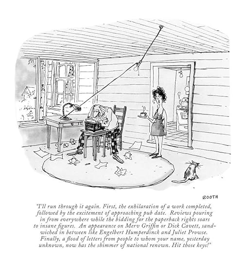 Something triggered in me (perhaps it was that alien probe appointment two Wednesdays ago?*) a renewed interest in longtime New Yorker cartoonist George Booth. Rather than sensibly spreading them out over time, I ordered everything my library has. Bring on the George! Three volumes of his cartoons showed up at once. I read them all in short order (not a difficult task), three sessions, multi-tasking on the elliptical bike. Many of these cartoons were familiar, as we were subscribers for maybe 15 years, plus many of these turn up on the web and/or were reprinted elsewhere (such as in Self-Editing for Fiction Writers, Renni Brown & Dave King—a terrific and practical book, btw). Without question, the art is fantastic throughout; weird, and beautiful. Humor, of course, is so very, very subjective. Consequently, many of his cartoons sent me into hysterics, nearly causing me to tumble from the elliptical bike, while others drew mild chuckles, and assorted others a silent meh, and rarely, a mouth-whispered wtf? The combination thereof was somewhat variable for each collection, hence the ratings range from 3.5 to 5 stars. Each is named after the title of the opening cartoon.