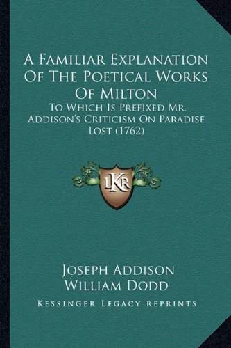 ""A Familiar Explanation of the Poetical Works of Milton"" is a book written by Joseph Addison and first published in 1762. The book provides a comprehensive analysis and interpretation of the works of the renowned poet John Milton, with a particular focus on his epic poem ""Paradise Lost"". The book is structured in a way that is accessible to readers of all levels of familiarity with Milton's works. It begins with a preface by Addison, in which he shares his own thoughts on Milton's poetry and provides a brief overview of the contents of the book. The main body of the book is divided into chapters, each of which focuses on a specific aspect of Milton's poetry. These include discussions on the themes, characters, and style of ""Paradise Lost"", as well as analysis of some of Milton's other works, such as ""Comus"" and ""Lycidas"". Throughout the book, Addison provides his own insights and interpretations of Milton's poetry, drawing on his own knowledge and experience as a writer and critic. He also includes excerpts from other critics and scholars who have written about Milton's works, providing readers with a range of perspectives on the poet's work. The book concludes with a reprint of Addison's own famous critique of ""Paradise Lost"", which was originally published in 1712. In this critique, Addison praises Milton's epic poem as a masterpiece of English literature, and provides his own analysis of its themes, characters, and style. Overall, ""A Familiar Explanation of the Poetical Works of Milton"" is an essential guide for anyone seeking to gain a deeper understanding of the works of one of England's greatest poets. Its accessible language and comprehensive analysis make it an invaluable resource for students, scholars, and general readers alike.This scarce antiquarian book is a facsimile reprint of the old original and may contain some imperfections such as library marks and notations. Because we believe this work is culturally important, we have made it available as part of our commitment for protecting, preserving, and promoting the world's literature in affordable, high quality, modern editions, that are true to their original work.