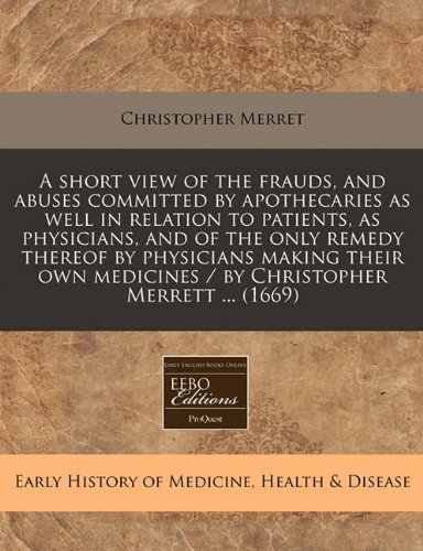 A short view of the frauds, and abuses committed by apothecaries as well in relation to patients, as physicians, and of the only remedy thereof by physicians making their own medicines / by Christopher Merrett ... Merret, Christopher, 1614-1695. p. 53. [3], 5-53 p. London : Printed for James Allestry ..., 1669. Wing / M1843 English Reproduction of the original in the Henry E. Huntington Library and Art Gallery