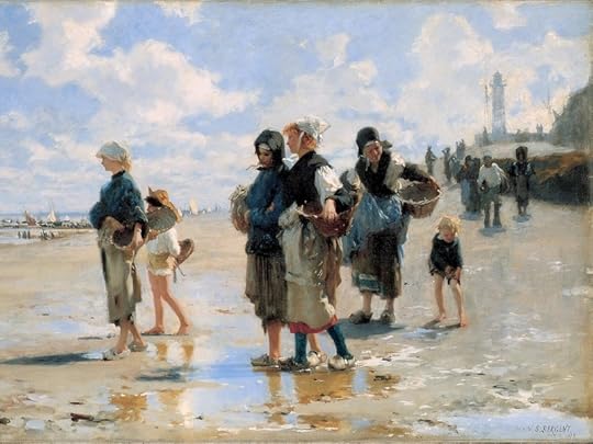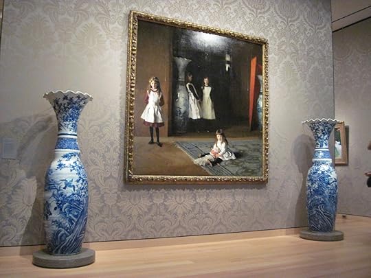 The artist has done nothing more felicitous and interesting than this view of a rich, dim, rather generalized French interior (the perspective of a hall with a shining floor, where screens and tall Japanese vases shimmer and loom)... The treatment is eminently unconventional, and there is none of the usual symmetrical balancing of the figures in the foreground. The place is regarded as a whole; it is a scene, a comprehensive impression; yet none the less do the little figures in their white pinafores (when was the pinafore ever painted with that power and made so poetic?) detach themselves, and live with a personal life.. a pair of immensely tall emblazoned jar .. seem also to partake of the life of the picture; the splendid porcelain and the aprons of the children shine together, and a mirror in the brown depth behind them catches the light... The naturalness of the composition, the loveliness of the complete effect, the light, free security of the execution, the sense it gives us as of assimilated secrets and instinct and knowledge playing together.