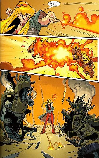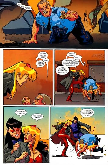 For no apparent reason whatsoever, this just feels like a really dated book. It's not that the jokes are un-PC or anything. It just feels reeeally early aughts to me. Very bleached tips. Very Josie and the Pussycats: The Movie. Very Fantastic Four 2.