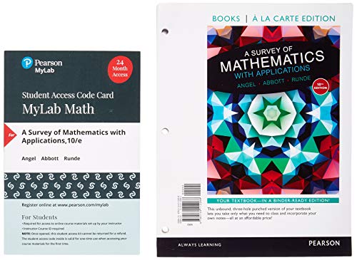 NOTE: Before purchasing, check with your instructor to ensure you select the correct ISBN. Several versions of Pearson's MyLab & Mastering products exist for each title, and registrations are not transferable. To register for and use Pearson's MyLab & Mastering products, you may also need a Course ID, which your instructor will provide. Used books, rentals, and purchases made outside of Pearson If purchasing or renting from companies other than Pearson, the access codes for Pearson's MyLab & Mastering products may not be included, may be incorrect, or may be previously redeemed. Check with the seller before completing your purchase. For courses covering general topics in math course, often called liberal arts math, contemporary math, or survey of math.This package includes MyMathLab(R).Everyday math, everyday language. The Tenth Edition of A Survey of Mathematics with Applications continues the tradition of showing students how we use mathematics in our daily lives and why it's important, in a clear and accessible way. With straightforward language, detailed examples, and interesting applications, the authors ensure non-majors will relate to the math and understand the mathematical concepts that pervade their lives. With this revision, an expanded media program in MyMathLab, and a new workbook further build upon the tradition of motivating and supporting student learning. Personalize learning with MyMathLab MyMathLab is an online homework, tutorial, and assessment program designed to work with this text to engage students and improve results. Within its structured environment, students practice what they learn, test their understanding, and engage with media resources to help them absorb course material and understand difficult concepts. NEW! This edition's MyMathLab course provides additional tools to help with understanding and preparedness. 0134115767 / 9780134115764 * A Survey of Mathematics with Applications plus MyMathLab Student Access Card -- Access Code Card Package Package consists of: 0134112105 / 9780134112107 * A Survey of Mathematics with Applications 0321431308 / 9780321431301 * MyMathLab -- Glue-in Access Card 0321654064 / 9780321654069 * MyMathLab Inside Star Sticker