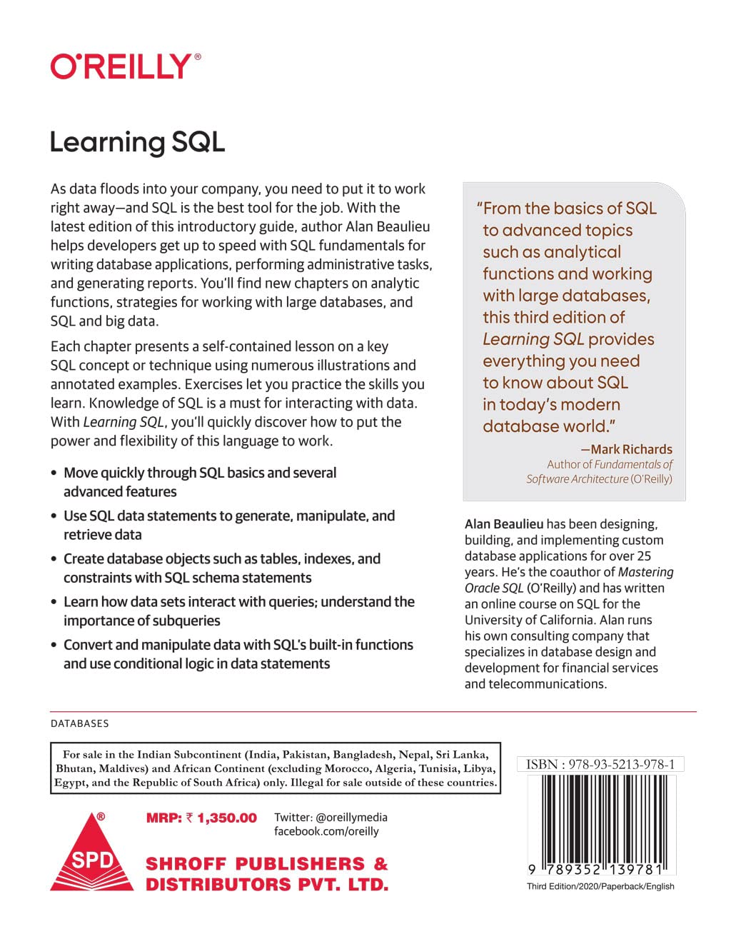 Updated for the latest database management systems -- including MySQL 6.0, Oracle 11g, and Microsoft's SQL Server 2008 -- this introductory guide will get you up and running with SQL quickly. Whether you need to write database applications, perform administrative tasks, or generate reports, Learning SQL, Second Edition, will help you easily master all the SQL fundamentals.Each chapter presents a self-contained lesson on a key SQL concept or technique, with numerous illustrations and annotated examples. Exercises at the end of each chapter let you practice the skills you learn. With this book, you Move quickly through SQL basics and learn several advanced featuresUse SQL data statements to generate, manipulate, and retrieve dataCreate database objects, such as tables, indexes, and constraints, using SQL schema statementsLearn how data sets interact with queries, and understand the importance of subqueriesConvert and manipulate data with SQL's built-in functions, and use conditional logic in data statements