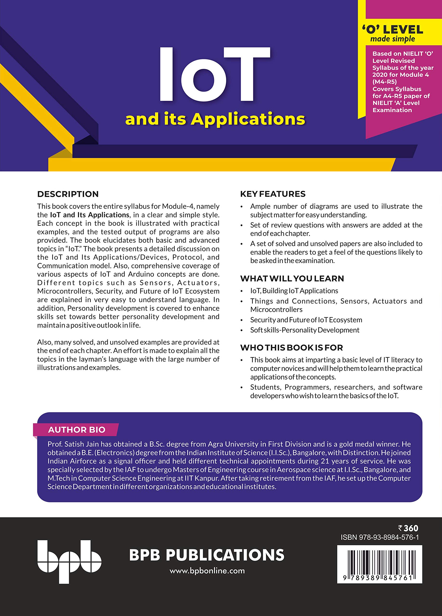 Based on NIELIT ‘O’ Level Revised Syllabus of the year 2020 for Module 4 (M4-R5)Key Features● Ample number of diagrams are used to illustrate the subject matter for easy understanding.● Set of review questions with answers are added at the end of each chapter.● A set of solved and unsolved papers are also included to enable the readers to get a feel of the questions likely to be asked in the examination.DescriptionThis book covers the entire syllabus for Module-4, namely the Internet of Things and Its Applications, in a clear and simple style. Each concept in the book is illustrated with practical examples, and the tested output of programs are also provided. The book elucidates both basic and advanced topics in “IoT.” The book presents a detailed discussion on the Internet of Things and Its Applications/Devices, Protocol, and Communication model. Also, comprehensive coverage of various aspects of IoT and Arduino concepts are done. Different topics such as Sensors, Actuators, Microcontrollers, Security, and Future of IoT Ecosystem are explained in very easy to understand language. In addition, Personality development is covered to enhance skills set towards better personality development and maintain a positive outlook in life.Also, many solved, and unsolved examples are provided at the end of each chapter. An effort is made to explain all the topics in the layman’s language with the large number of illustrations and examples.What will you learn● Internet of Things, Building IoT Applications● Things and Connections, Sensors, Actuators and Microcontrollers● Security and Future of IoT Ecosystem● Soft skills-Personality DevelopmentWho this book is for● This book aims at imparting a basic level of IT literacy to computer novices and will help them to learn the practical applications of the concepts.● Students, Programmers, researchers, and software developers who wish to learn the basics of the Internet of Things.Table of Contents1. Introduction to Internet of Things2. Things and Connections3. Sensors, Actuators and Microcontrollers4. Building IoT Applications5. Security and Future of IoT Ecosystem6. Soft skills-Personality Development About the Authors Prof. Satish Jain has obtained a B.Sc. degree from Agra University in First Division and is a gold medal winner. He obtained a B.E. (Electronics) degree from the Indian Institute of Science (I.I.Sc.), Bangalore, with Distinction. He joined Indian Airforce as a signal officer and held different technical appointments during 21 years of service. He was specially selected by the IAF to undergo Masters of Engineering course in Aerospace science at I.I.Sc., Bangalore, and M.Tech in Computer Science Engineering at IIT Kanpur. After taking retirement from the IAF, he set up the Computer Science Department in different organizations and educational institutes.