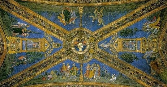 And since religion was so very intricately connected to lay power, the last chapter is dedicated to Halls of State. There one finds the discussion of the extraordinary Sala dei Santi in the Borgia Apartments in the Vatican. They were decorated by Pinturicchio. On the walls we have expected themes, such as scenes from the Bible and from various saints, but the vault. My! The vault! They represent the myths of Osiris and Isis (Partridge explains that these Egyptian deities were part of the esoteric interests of pope Borgia’s secretary: Giovanni Annio of Viterbo.