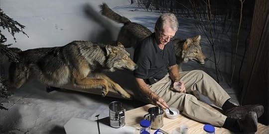 Here a MMNH curator touches up the all-time best hunting wolf diorama.
