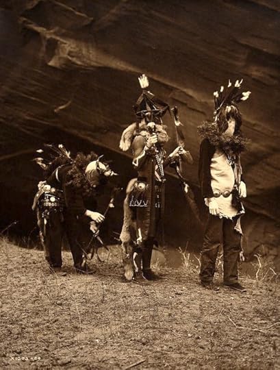 Museum politics and controversies surrounding Native American studies was part of the twisty plot. So was Yeibachai, the great Talking God of the Navajo night chant. These are photographs of the Night ceremony taken by Edward Curtis in 1904. I think the figure on the far right is wearing the Talking God mask.