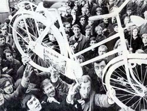 Il “Piano delle biciclette bianche” del 1965, lanciato ad Amsterdam dal movimento dei Provos, gruppo anarco-situazionista, che tra il 1965 e il 1967 ingaggiò una vera e propria guerriglia culturale non violenta contro le fondamenta del sistema di pensiero borghese di quegli anni, anticipando così alcune parole d’ordine del ’68.