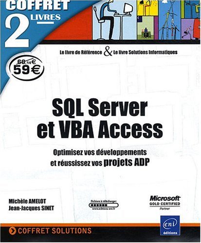 SQL Server et VBA Access . Optimisez vos développements et réussissez vos projets ADP . Ces deux livres offrent au lecteur un maximum d'informations sur VBA Access pour mieux maîtriser le développement de projets ADP (Access Data Project) qui permettent d'allier Access et SQL Server. Des éléments sont en téléchargement sur le site www.editions-eni.fr. . Le livre de la collection Ressources informatiques VBA Access 2007 . A la fois simple, pratique et complet, ce livre s'adresse aux développeurs et aux utilisateurs avertis souhaitant créer des applications professionnelles conviviales, fiables et performantes sous Access. Outre les éléments de base du langage VBA vous permettant de créer vos propres procédures et fonctions, vous apprendrez à manipuler vos données en utilisant les objets DAO ou ADO et le langage SQL, à personnaliser vos formulaires et états, à concevoir un ruban Access spécifique à votre application, à piloter les autres applications Office 2007 via la technologie Automation, à exporter des informations sur Internet (au format XML ou HTML) et à utiliser les API Windows. En plus des nombreux exemples fournis dans cet ouvrage le dernier chapitre vous guide dans la création d'une mini-application Access.. Le livre de la collection Informatiques . Access et SQL Server . Ce livre s'adresse aux développeurs Access désirant porter leurs applications sous SQL Server, mais également aux utilisateurs de SQL Server cherchant un outil rapide et performant pour le développement d'applications frontales. Les projets ADP permettent de conserver ou d'utiliser toute la convivialité et la facilité de développement d'Access (requêtes, formulaires, états) et de bénéficier en plus de toute la puissance et la sécurité de SQL Server (rapidité, gestion de volumes de données importants, grand nombre d'accès simultanés, administration centralisée). Après une partie dédiée à la présentation des éléments techniques, l'auteur illustre les différentes technologies avec des exemples pratiques et facilement réutilisables. Les exemples traités s'appliquent aux versions 2000 à 2007 d'Access et 2000 à 2005 de SQL Server..