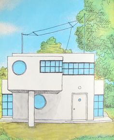 Garth Williams's illustrations are wonderful as usual, black pen and ink with saturated washes of aqua, pistachio green, yellow, and gray. I had a vintage illustrationgasm when I turned the first page and the little girl and her mother were sitting at a Saarinen table in tulip chairs (the text and illustrations are from 1963). The mother tells her daughter that "I lived in a house like this" and we see a white International Style structure: