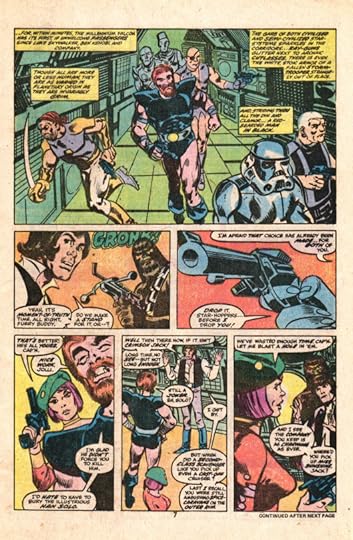 All of that and I haven't even talked about the art, which is just ugly as hell. I don't understand the series of decisions that led to this color palette but it's a shame. Everyone is splotchy and clashing and nothing ever looks good or cool or beautiful. And even the pencilling is bizarre. The sense that the character dialogue is either generated by a markov chain trained on the films or represents totally new people is exacerbated by the character designs, which are both unrecognizable and ugly. Why is Leia dressed that way?? Like parachute pants? And her hair somehow constantly falling at an angle from her head such that her profile is a trapezoid? So weird!