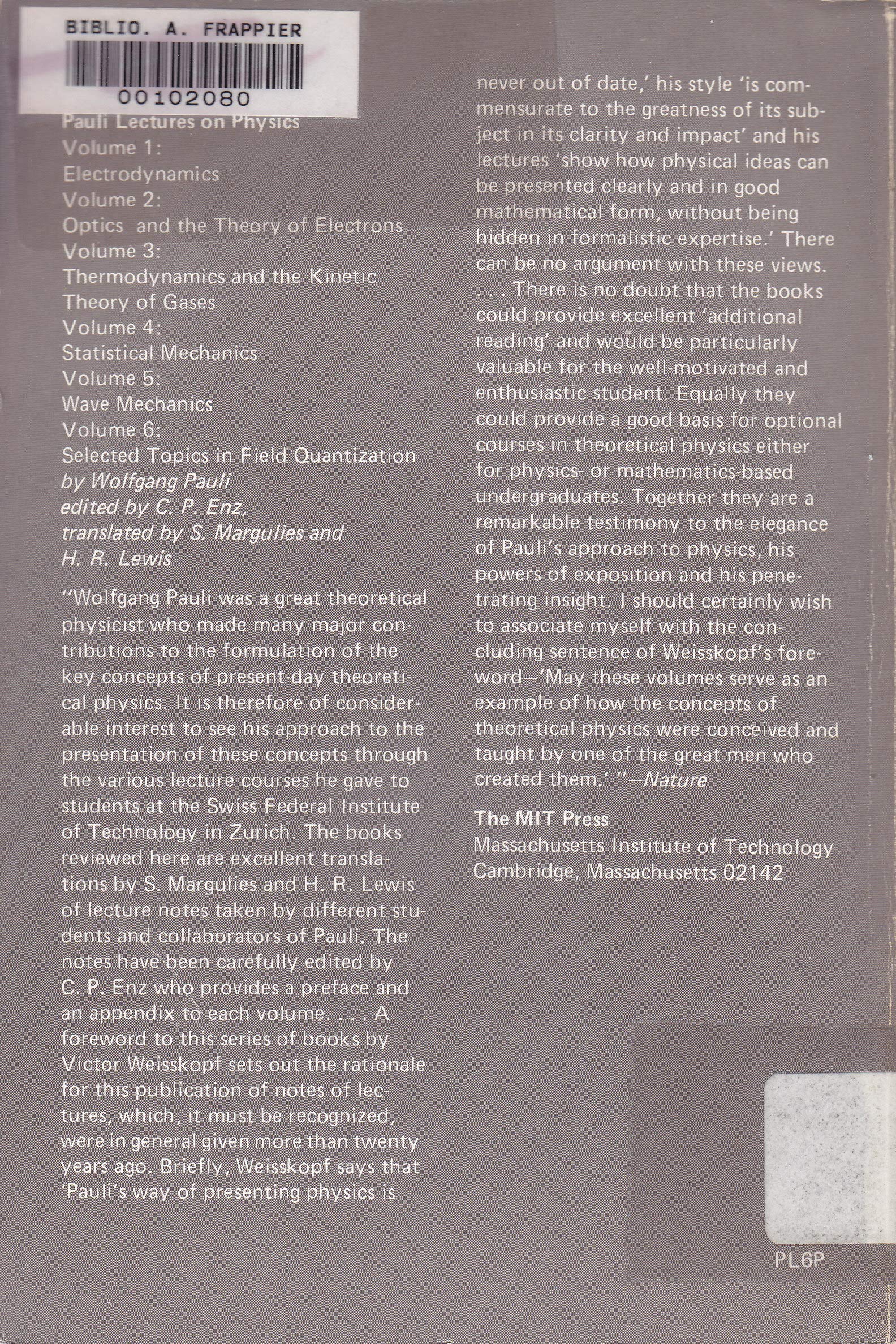 "It is often said that scientific texts quickly become obsolete. Why are the Pauli lectures brought to the public today, when some of them were given as long as twenty years ago? The reason is Pauli's way of presenting physics is never out of date. His famous article on the foundations of quantum mechanics appeared in 1933 in the German encyclopedia Handbuch der Physik. Twenty-five years later it reappeared practically unchanged in a new edition, whereas most other contributions to this encyclopedia had to be completely rewritten. The reason for this remarkable fact lies in Pauli's style, which is commensurate to the greatness of its subject in its clarity and impact. Style in scientific writing is a quality that today is on the point of vanishing. The pressure of fast publication is so great that people rush into print with hurriedly written papers and books that show little concern for careful formulation of ideas. Mathematical and instrumental techniques have become complicated and difficult today; they demand so much skill and training that most of the effort of writing and learning is devoted to the acquisition of this skill instead of insight into important concepts. Essential ideas of physics are often lost in the dense forest of mathematical reasoning. This situation need not be so. Pauli's lectures show how physical ideas can be presented clearly and in good mathematical form, without being hidden in formalistic expertise."