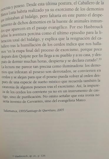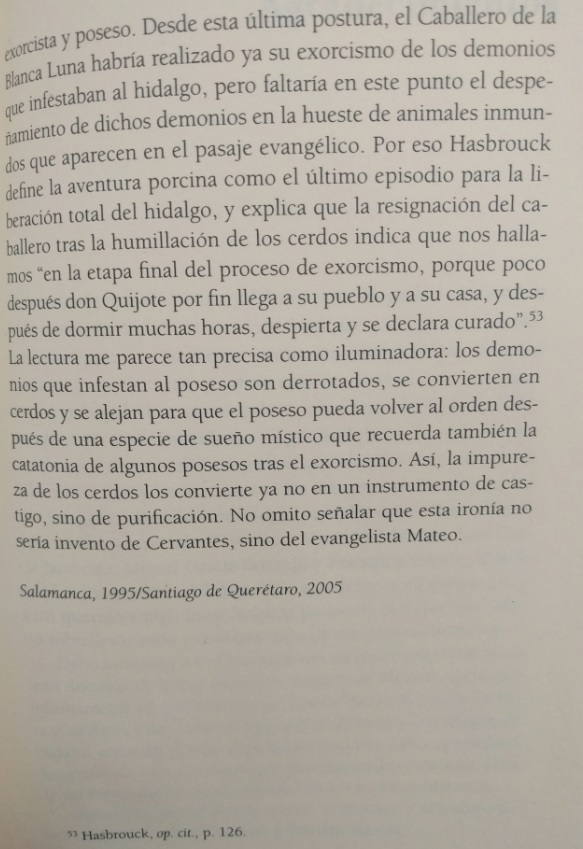 Finalmente, unas últimas reflexiones en el libro de Padilla acerca del final del Quijote. Padilla dice que todas las aventuras quijotescas se pueden leer como una gran aventura única de posesión demoniaca, con todas las pesadillas, tormentas, rotaciones de cabeza y vómitos verdes de rigor; que termina con un exorcismo en el cual los demonios o legiones salen convertidos en una manada de cerdos que acaban por dispersarse y dejar libre al pobre Quijote que después de unas horas de sueño reparador se despierta para declararse curado; es decir, exorcisado: