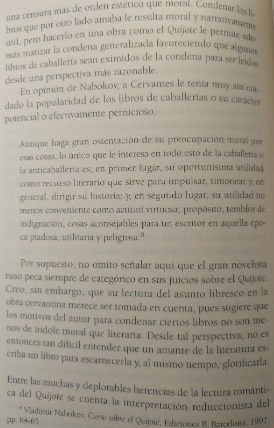 En la siguiente imagen, aparece una reflexión de Padilla sobre los posibles motivos que llevaron a Cervantes a convertir su obra en una velada aventura satánica. Según Padilla, poco le importaba a Cervantes la seriedad del tema en sí; él sólo buscaba servir a la Literatura, como -siempre según Padilla- Navokov también utilizaba un tema tabú al servicio de un efecto literario más grande que el mismo tema, su seriedad o su potencial para generar polémica: