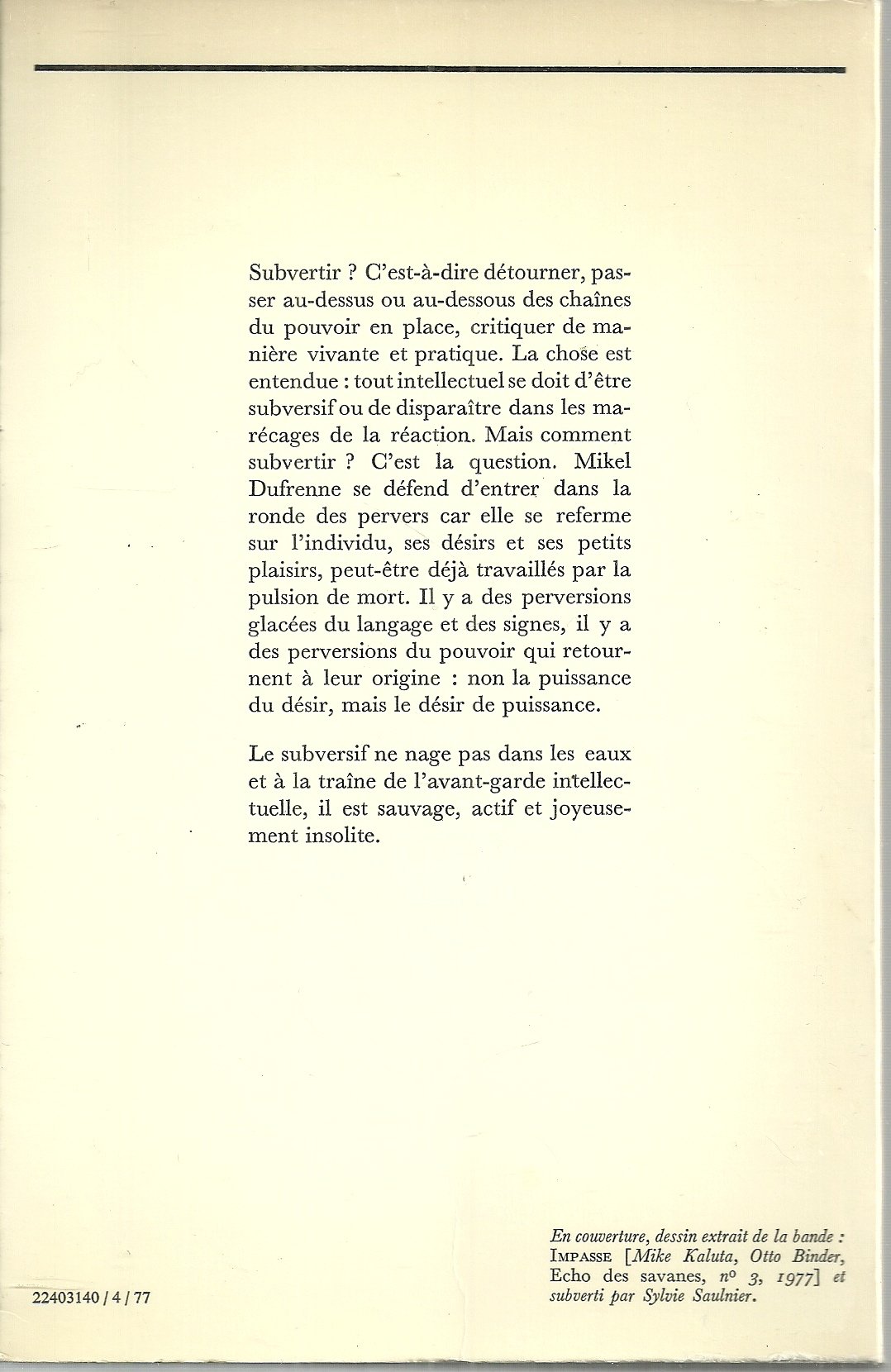 Subvertir ? C’est-à-dire détourner, passer au-dessus ou au-dessous des chaînes du pouvoir en place, critiquer de manière vivante et pratique. La chose est entendue : tout intellectuel se doit d’être subversif ou de disparaître dans les marécages de la réaction. Mais comment subvertir ? C’est la question. Mikel Dufrenne se défend d’entrer dans la ronde des pervers car elle se referme sur l’individu, ses désirs et ses petits plaisirs, peut-être déjà travaillés par la pulsion de mort. Il y a des perversions glacées du langage et des signes, il y a des perversions du pouvoir qui retournent à leur origine : non la puissance du désir, mais le désir de puissance. Le subversif ne nage pas dans les eaux et à la traîne de l’avant-garde intellectuelle, il est sauvage, actif et joyeusement insolite.