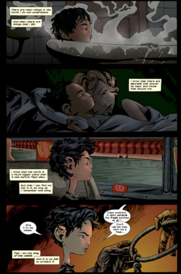 Plot-wise, the story takes a while to get going. Quite a while. By chapter four, I was starting to think the story wasn't going where the back cover had hinted it was and I was being cheated, but there was a quick turnabout that had be very satisfied by the end of the volume. On the plus side, while the plot moves slowly (at least in the beginning), important things are still happening: there is fantastic, constant development of characters, setting, and mood. The text boxes are from Enrico's perspective and I can't remember ever reading a comic where the text was so involved in fleshing out the senses the comic itself can't give us - the smells, the sounds, the feelings in Enrico's head. There's a reason Joe Kelly is one of the greats and there was many times it felt more like I was reading a graphic novel adaption of a novel, rather than an original graphic novel.