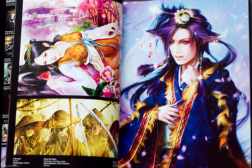 Since every piece is digitally created, the style of art is pretty similar - which may be the book's selling point here. But when your style of art is similar and everyone is good technically, it's hard to stand out. Yes, the costumes and pretty faces are awesome, but what I find lacking is the dynamic poses, especially of characters in action. Most of the characters are created with a particular role in mind, so it will really add to the character and personality if that role is acted out more clearly.