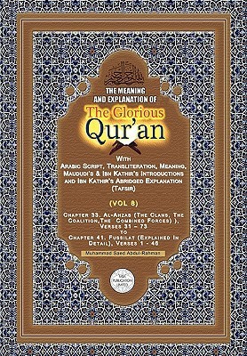 This is volume eight of ten volumes. Our mission is to gather in one place, for the English-speaking public, all relevant information needed to make the Qur'an more understandable and easier to study. This book tries to do this by providing the following: 1. The Arabic Text for those who are able to read Arabic 2. Transliteration of the Arabic text for those who are unable to read the Arabic script. This will give them a sample of the sound of the Qur'an, which they could not otherwise comprehend from reading the English meaning. 3. The meaning of the qur'an (translated by Dr. Muhammad Taqi-ud-Din Al-Hilali, Ph.D. and Dr. Muhammad Muhsin Khan) 4. Background introductions by two famous Islamic scholars, Maududi and Ibn Kathir 5. Explanation (abridged Tafsir) by Ibn Kathir (translated by Safi-ur-Rahman al-Mubarakpuri) We hope that by doing this an ordinary English-speaker will be able to pick up a copy of this book and study and comprehend The Glorious Qur'an in a way that is acceptable to the understanding of the Rightly-guided Muslim Ummah (Community).