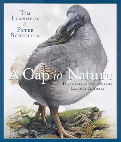 Yes, I do very well and also totally understand and accept why (and also that) Tim Flannery's 2001 book A Gap in Nature: Discovering the World's Extinct Animals is not only interesting and enlightening (and with Peter Schouten's lushly colourful accompanying artwork providing a nicely appealing visual mirror to and for Flannery's easy to read and delightfully scientific jargon free featured text) but is also first and foremost quite massively depressing, since the subject matter of human caused animal extinctions is of course, is naturally hugely depressing, and indeed, if Tim Flannery were not to make his presented text for A Gap in Nature: Discovering the World's Extinct Animals upsetting and distressing, A Gap in Nature: Discovering the World's Extinct Animals would in my humble opinion be at best rather lacking in oh so many many ways (and would also of course be just wrong, wrong, wrong).