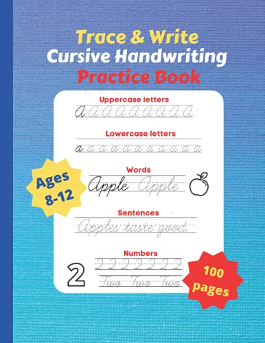 This 8.5x11 Cursive Handwriting Practice Book helps anyone beginning to learn to write cursive letters, words, numbers, and sentences and to improve their handwriting. Kids can gain mastery over cursive writing using an easy tracing method. The guided writing practice progressively builds kid's cursive skills beginning with With 100 pages of practice, your child will continue to develop their fine motor skills as they become more confident in writing in cursive Buy today , to help your child take their first step confidently into the fun world of cursive writing.