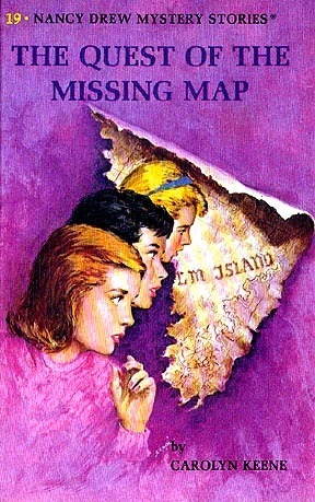 Nancy Drew learns of a treasure map that has been torn in half and given t two twin brothers. Finding the other twin and the other half of the map is What Nancy sets out to do, and of course, there are crooks who are also looking for the map. Strangely, I knew where the map was because it was so obvious to me.