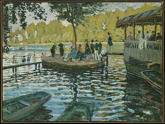 'In 1869, Pissarro painted with Monet and Renoir at La Grenouillère [on the Island of La Chaussée on the Seine], near his residence. The painters were fascinated by the reflections of the light in the water, which they attempted to capture with brief, wide strokes of the brush.'
