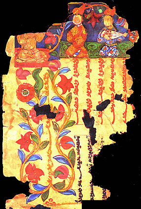 صفحة من تراتيل مانوية وجدت في وسط آسيا تعود إلى حوالي القرن الحادي عشر، و فوق الكتابات المزينة مجموعة من الموسيقيين ---