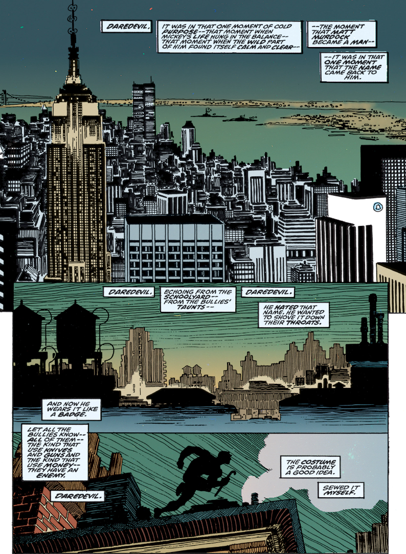 "Let all the bullies know - all of them - the kind that use knives and guns and the kind that use money - they have an enemy. Daredevil."