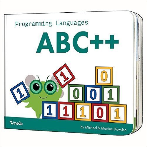 Super cute book. Alphabet book of programming languages. Each page shows a "Hello world" type code snippet in the language. The illustration on each page is of a different programming-related word that begins with that letter.