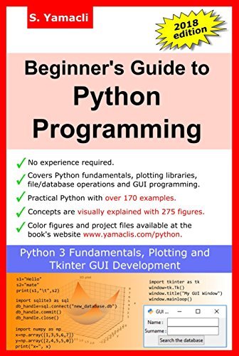 This book covers Python 3 programming fundamentals together with 2D and 3D plotting, numerical library numpy, file/Sqlite database operations and tkinter graphical user interface development (i.e. developing desktop applications) in Python. The author assumes that you have little or no programming experience. The book is divided into 4 parts. The first part of the book includes Chapters 1 to 9 where the fundamentals of the Python programming language are explained. The book starts with the installation of Python 3 programming environment and the simplest "Hello World" example. Then, all the fundamental concepts such as variables, conditional statements, loops, functions, modules and object-oriented programming are given. The second part of the book consists of Chapters 10 and 11 which cover file and Sqlite database operations in detail. The third part of the book teaches the basics of the numpy numerical library and the matplotlib plotting library in Chapters 12 and 13. The reader will be able to plot data saved in numpy arrays in 2D or 3D after completing this part. The last part of the book is about graphical user interface (GUI) development using the tkinter library in Chapter 14. Layout management and all the frequently used tkinter widgets are given with detail and working examples. This book includes 275 figures and over 170 examples used for explaining Python programming clearly. Full resolution colour figures and example files can be downloaded from the book's companion www.yamaclis.com/python.