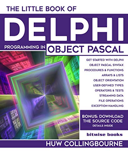 Fundamentals of Delphi The Object Pascal language Object Orientation Variables, Types, Constants Operators and Tests for loops and while loops Procedures and Functions Parameters and Arguments Arrays and Lists String Operations Case Statements User-defined Types Constructors and Methods Creating and Freeing Objects Inheritance and Encapsulation Virtual and Overridden Methods File-handling Text files and Binary files Streaming and Serialization Errors and Exceptions ...and much moreThe Little Book Of Delphi takes you from the very basics of Object Pascal programming right through to complex topics such saving and loading networks of objects to and from disk’. All the source code is provided as a free download from the publisher's web site. The book explains everything you need to know to get started with productive Delphi development.