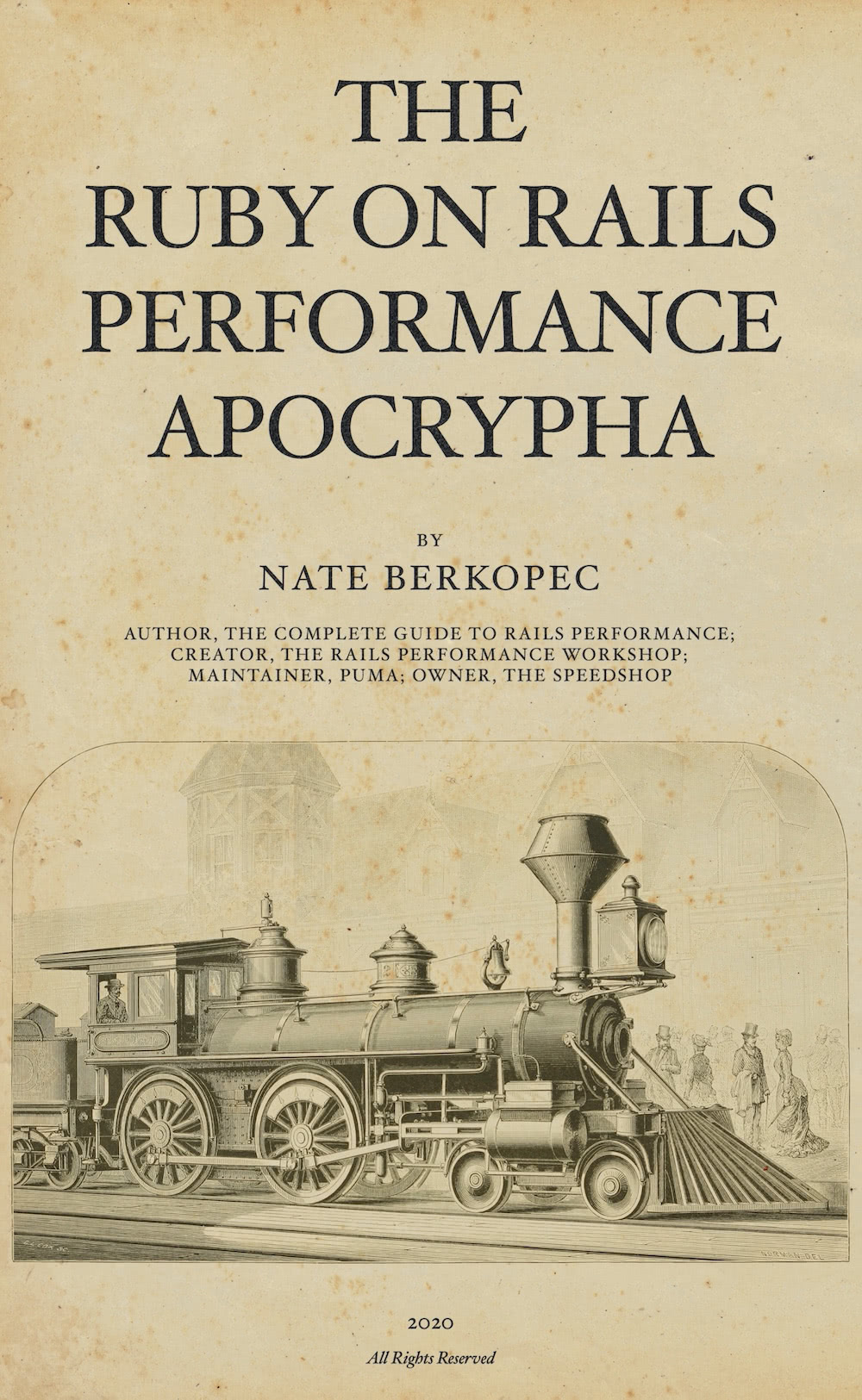 The world's foremost Ruby on Rails performance expert and maintainer of the popular Puma webserver, Nate Berkopec, has compiled 4 years of short-form writing into a single volume: The Ruby on Rails Performance Apocrypha.