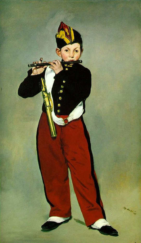 On a trip to Spain in 1865, Édouard Manet visited the Prado, where the art of Diego Velázquez was a revelation. Upon his return to Paris in 1866, he began work on a new painting, depicting an anonymous regimental fifer of the Spanish army. In this picture, Manet presents the uniformed boy, in a manner that imitates and inverts the formula of Vélazquez's court portraits, against a barely inflected, flattened background of neutral tone, thus frustrating attempts to assess the figure's true size and, by extension, importance.
