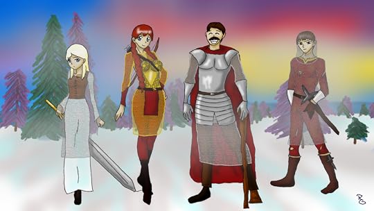 1) The pic above was done by my daughter. Its of some of my characters in an anime-ish style. Sami on the left, Rue, the tall redhead, Zarue with the missing leg, and Orn on the right. I love this pic. I have it on the wall near my bed. I want her to do another, but...she's lost the inspiration