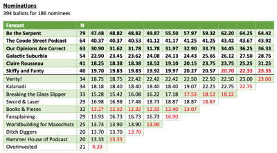 The Sword & Laser numbersSword & Laser didn't make the 2020 cut which was 40 nominations, and more people are nominating fancasts than fanzines.