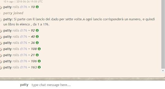 In questo topic verranno indicati i sette libri abbinati ai sette numeri che la sorte ha scelto per noi. Come al solito mi sono servita della piattaforma Rolz.org per lanciare il dado. Lancerò il dado per sette volte, a ogni lancio corrisponderà un numero, e quindi un libro in elenco, da 1 a 176 .Tanti sono infatti i libri finora inseriti nella nostra bellissima listaMille libri per mille lettori l.Intanto voglio invitare i nuovi iscritti e coloro che non l'avessero ancora fatto , di arricchire la nostra lista con il titolo del proprio libro del cuore così da creare un vero tesoro cui attingere a piene mani suggerimenti di lettura collaudata.