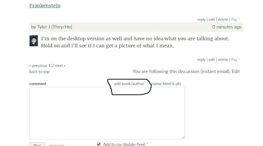 It says book or author, it is on book by default but you can also click on author and the box below you type in the title of the book (or name of the author) and click the word search below the box and a list of books will pop up, and to the right of them is the word "add" and you can click that for the book you want and it'll add a link to the comment box.