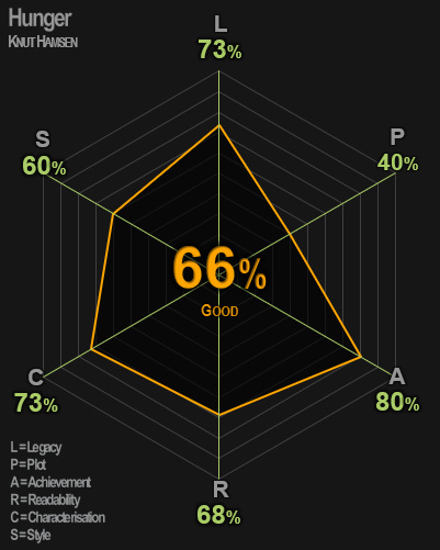 If you've not read Crime and Punishment , then this is a good place to start. Far, far shorter, it is nevertheless cram packed with the fevered wanderings of a protagonist whose own fate he fumbles daily. However, in Crime, although you can't really sympathise with the motive, you can with Raskolnikov's tortured mental outcome. In Hunger, you are constantly questioning why the narrotor doesn't ava ...more