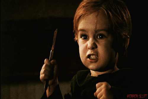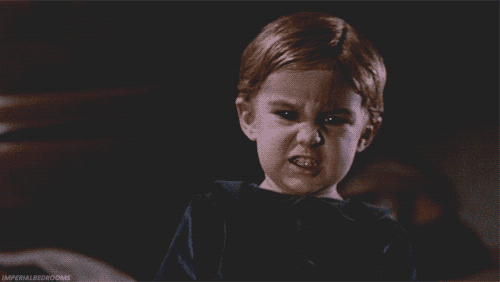jajajajajajjaja Tal cual, me acuerdo que el libro sí me había asustado! Está muy bueno! Y cuando vi la peli, esa cara del nene...jajaja ... me imaginaba al director del film diciéndole "ahora poné cara de malo" y al nene ahí actuando, era demasiado XD Me mataste de risa con esos gifs!! Que recuerdos jajaja