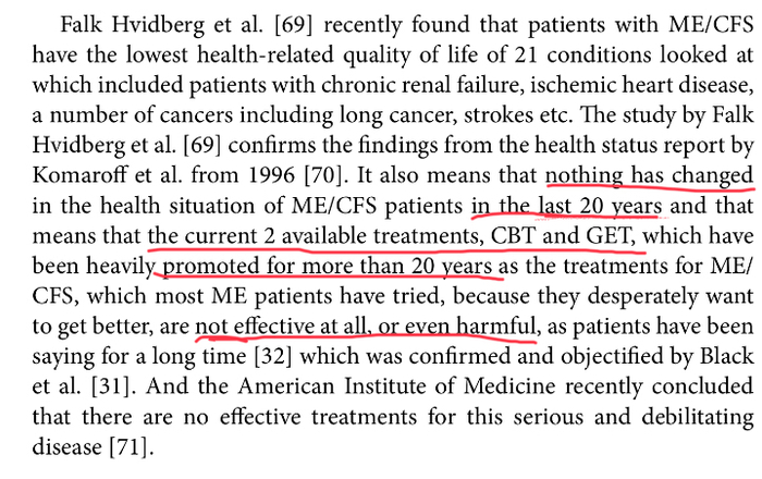 “The study by Falk Hvidberg et al. [69] confirms the findings from the health status report by Komaroffet al. from 1996 [70]. It also means that nothing has changed in the health situation of ME/CFS patients in the last 20 years and that means that the current 2 available treatments, CBT and GET, which have been heavily promoted for more than 20 years as the treatments for ME/ CFS, which most ME patients have tried, because they desperately want to get better, are not effective at all, or even harmful, as patients have been saying for a long time [32] which was confirmed and objectified by Black et al. [31].”