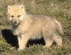 Cloud is a light gray wolf with white hairs sprinkled through the fur. His amber eyes are clouded from cataracts, making him blind. His ears are tipped black. When he is grown up, he will be thin but nicely muscled.