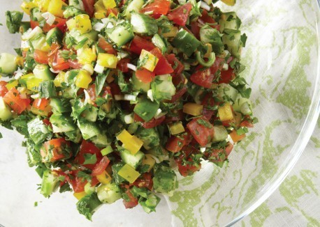 An Israeli breakfast staple, this salad is also often served with lunch and dinner. The salad is made with tomatoes, cucumbers, onion, and plenty of parsley. Some top it with feta and olives, or dress it with tahini sauce.