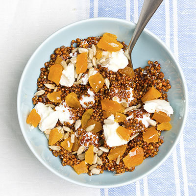 For healthy eating with a twist, swap your child's usual hot cereal with a steaming bowl of quinoa, a whole grain that also packs plenty of protein to help keep energy levels high and prevent a sugar crash mid-morning. Boil 3 cups of milk — skim, almond, or an alternative — with 1 cup of quinoa. Simmer for 10 minutes, stirring occasionally. Dish it out and top it with fresh raspberries, blueberries, 1 teaspoon each of cinnamon and brown sugar, and 1/2 teaspoon coconut oil. It's a colorful, sweet treat that may help keep kids focused all day long.